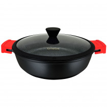 - Aluminio fundido: Cazuela baja antiadherente de Ø 32cm y 8,5cm de altura, fabricada en aluminio fundido en una sola pieza. Ofrece un diseño innovador y elegante con recubrimiento exterior integral en color negro e interior con moteado blanco tipo piedra con un gran nivel de acabado. Son robustas y muy resistentes a abrasiones y arañazos, además el efecto de granito aporta un diseño especial.